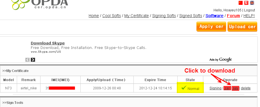 dan key kamu siap untuk diunduh dengan mengklik .cer dan .key untuk